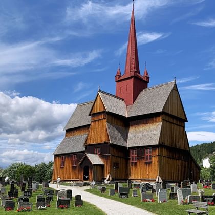 Videre til Ringebu Stavkirke fra år 1220 – et af Norges smukkeste historiske bygningsværker. Herfra kan I vandre til Falkestenen udsigtspunkt (4,4 km, 210 højdemeter) med flot panorama over dalen.