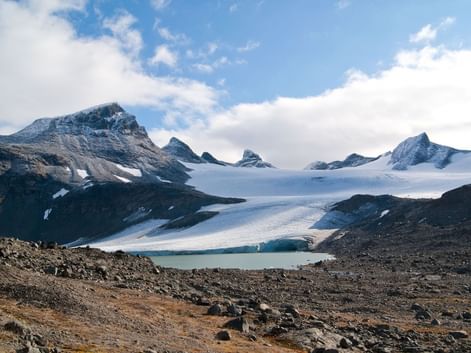 Fra parkeringen ved Krossbu (husk betaling) vandrer I gennem det vilde fjeldlandskab til den imponerende Leirbrean gletsjer. Undervejs får I enestående udsigter mod Fannaråki, fjeldet der bærer sin egen lille gletsjer. Hvis vejret er dårligt, byttes dag 8 og 9 – Leirbrean er bedst i klart vejr.