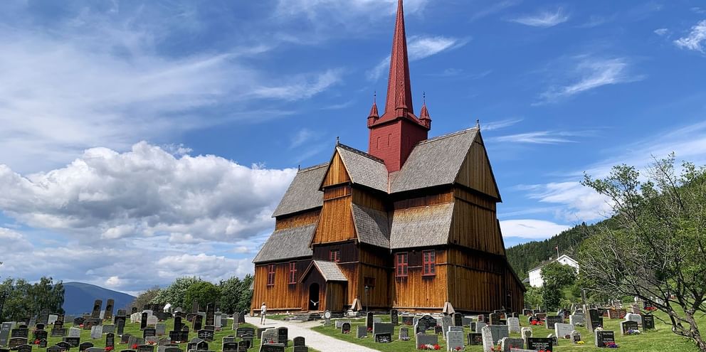 Videre mod Lom, hvor I kan gå over hængebroen og besøge den smukke Lom Stavkirke fra 1100-tallet.