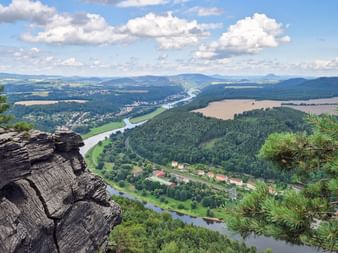 The final stage begins with steep steps through the Nadelöhr rock passage up to the Pfaffenstein. From the observation tower at the top, you are rewarded with stunning panoramic views. Following wooden walkways, you reach the Barbarine – the region’s iconic sandstone pillar. Continue past the Diebeshöhle to Königstein, where a climb to the fortress – the largest in Europe – offers unforgettable views. The stage ends at Thürmsdorf Castle, from where a short public transport ride takes you back to Pirna.