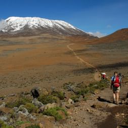Dagens etappe er litt kortere enn gårsdagens, og midt på ettermiddagen når dere fram til leiren på Shira-platået. Herfra har dere en betagende utsikt mot fjellet, og ved solnedgang kaster kveldssolen et varmt lys over Kibos klippevegger og isbreer.